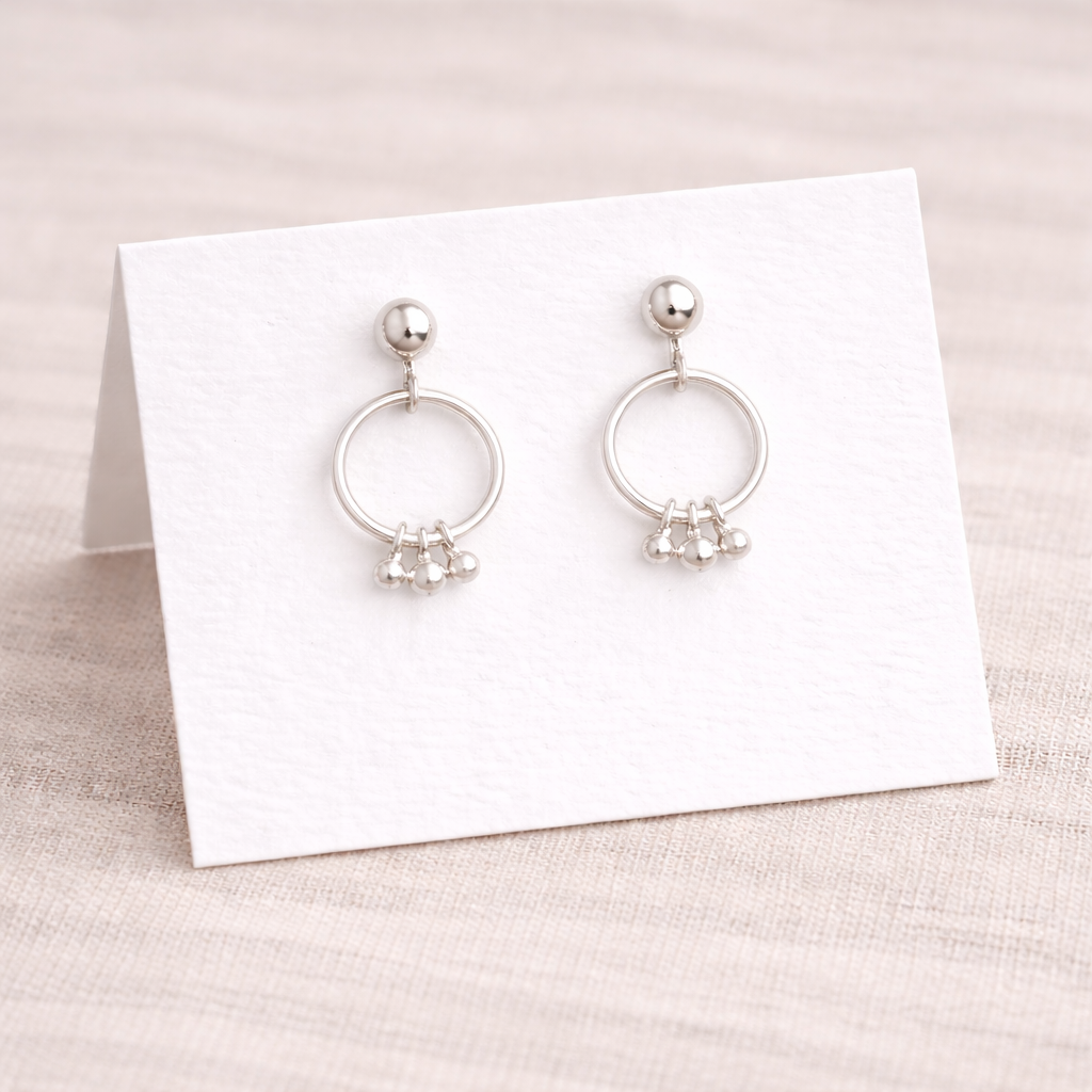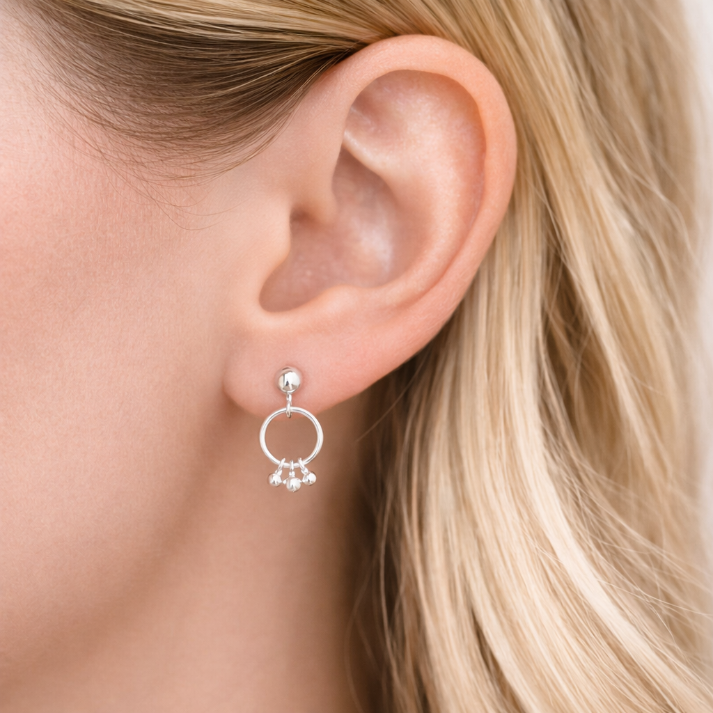 These 13mm sterling silver drop hoops feature a polished ball stud and a fine circular hoop finished with three tiny dangling beads. Light-catching and feminine, they add just enough detail while still feeling minimal and easy to wear.